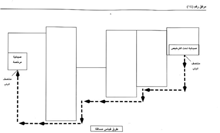 5- أن المسافة بين المكان المراد ترخيصه وأقرب صيدلية مرخصة لا تقل عن 100 متر وذلك من جميع الإتجاهات ومن خلال جميع الممرات العمومية والآمنة لعبور المشاه .